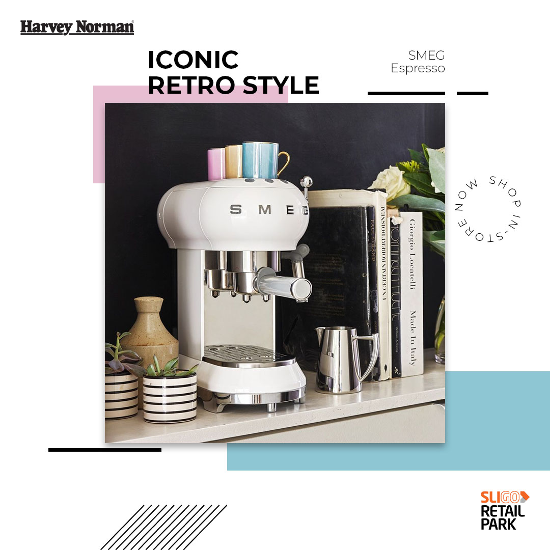 Don’t settle for instant, prepare your favourite coffee at home with this iconic 50’s retro style Smeg Espresso machine, exclusive of Harvey Norman store at Sligo Retail Park.